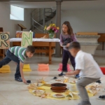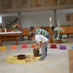 Das Wort „Erntedank“ buchstabierten die Kinder der Primarschule Langenbruck diesmal im Familiengottesdienst zum Erntedankfest. Erst war der Fussboden der Kirche noch fast leer und zum Schluss festlich geschmückt. Anschliessend blieben viele noch in gemütlicher Runde zusammen.